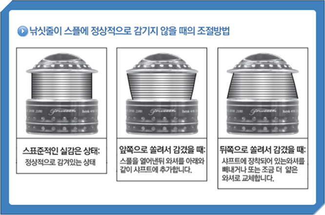 스피닝릴에 라인을 스풀에 감을 때, 라인이 스풀 위 또는 아래로 감기는데 릴 불량이 아닌가요?