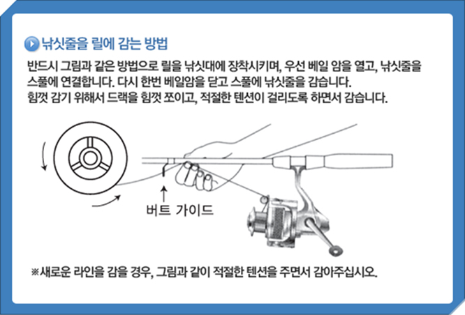 합사라인의 경우, 일반 모노라인(나일론)이나 후로로카본라인과 달리 릴의 스풀위에서 쉽게 밀립니다. 따라서, 스풀위에 합사라인을 바로 감지 않고 모노라인을 먼저 스풀에 밑줄 개념으로 약간 감아주십시오. 약 3회전 가량이 좋습니다. 그리고 그 모노라인에 합사라인을 연결하여 감게 되면 라인이 풀리는 문제가 쉽게 해결됩니다.